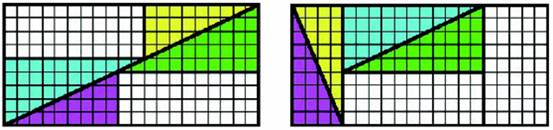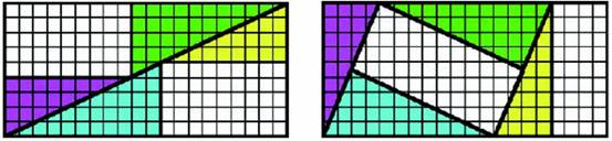 Las figuras que mostramos a continuación, debidas al profesor de la Universidad de Harvard Noam Elkies, corresponden a un rectángulo externo de dimensiones 20x9 del cual se pueden recortar cuatro triángulos y disponerlos de cuatro formas diferentes para que las regiones sobrantes tengan distintas áreas.